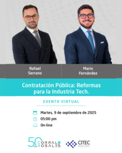 Acompáñanos en la conferencia de nuestros socios Corral Rosales “Contratación Pública: Reformas para la Industria Tech”, donde analizaremos los últimos cambios en ofertas, garantías, sanciones, pagos y otros puntos esenciales. ⚖️📑